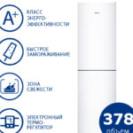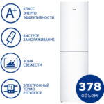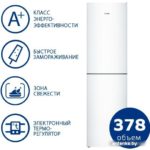 отдельностоящий, без No Frost, электронное управление, класс A+, полезный объём: 364 л (205 + 159 л), зона свежести, перенавешиваемые двери, полка для вина, лоток для яиц, 59.5x62.9x206.8 см, белый
