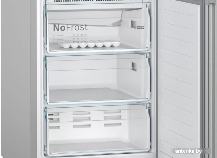 отдельностоящий, полный No Frost, электронное управление, класс A++, полезный объём: 384 л (233 + 107 л), инверторный компрессор, зона свежести, перенавешиваемые двери, складная полка, полка для вина, лоток для яиц, 59.5x68.2x203 см, серебристый