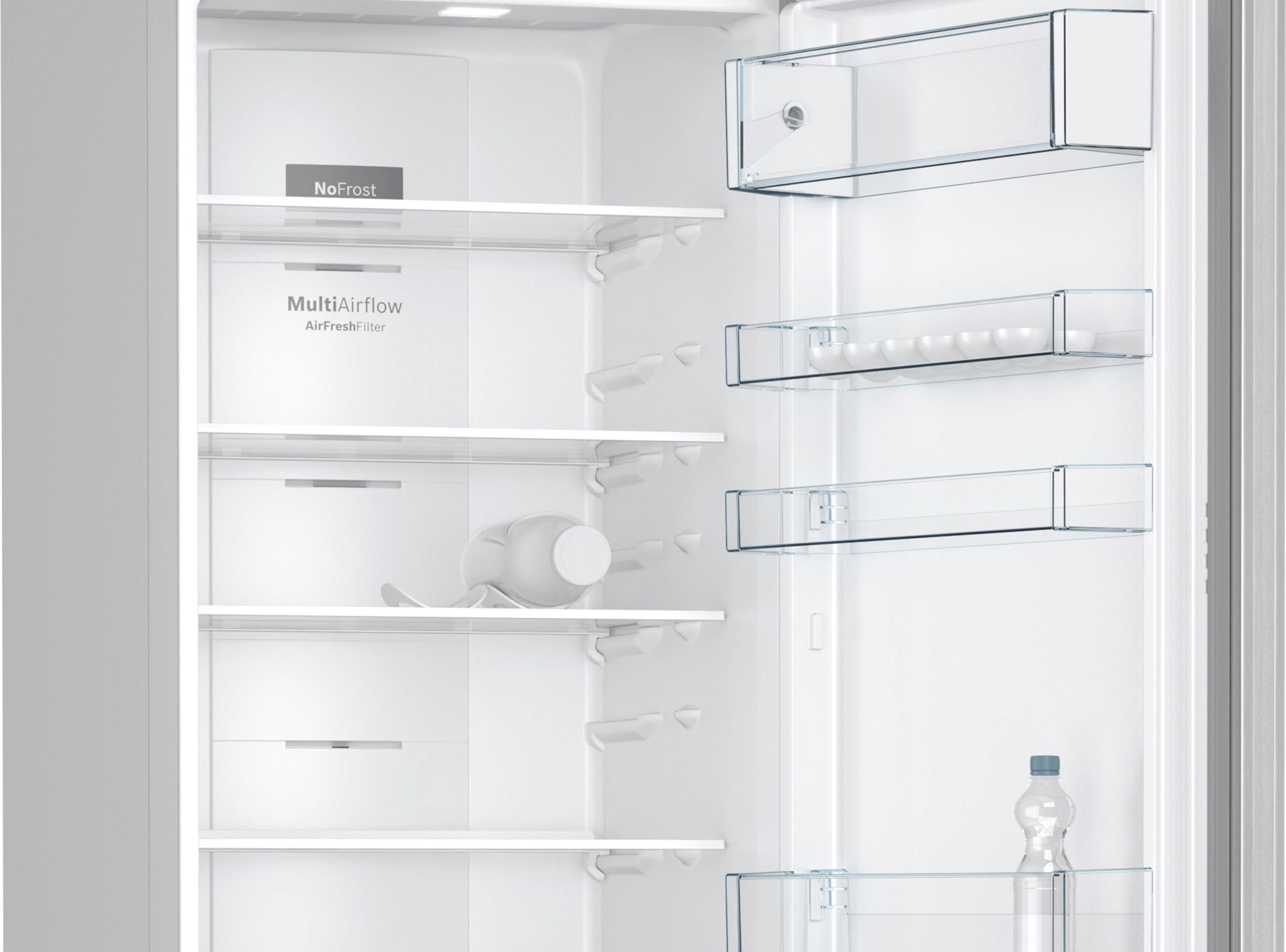 отдельностоящий, полный No Frost, электронное управление, класс A++, полезный объём: 384 л (233 + 107 л), инверторный компрессор, зона свежести, перенавешиваемые двери, складная полка, полка для вина, лоток для яиц, 59.5x68.2x203 см, серебристый
