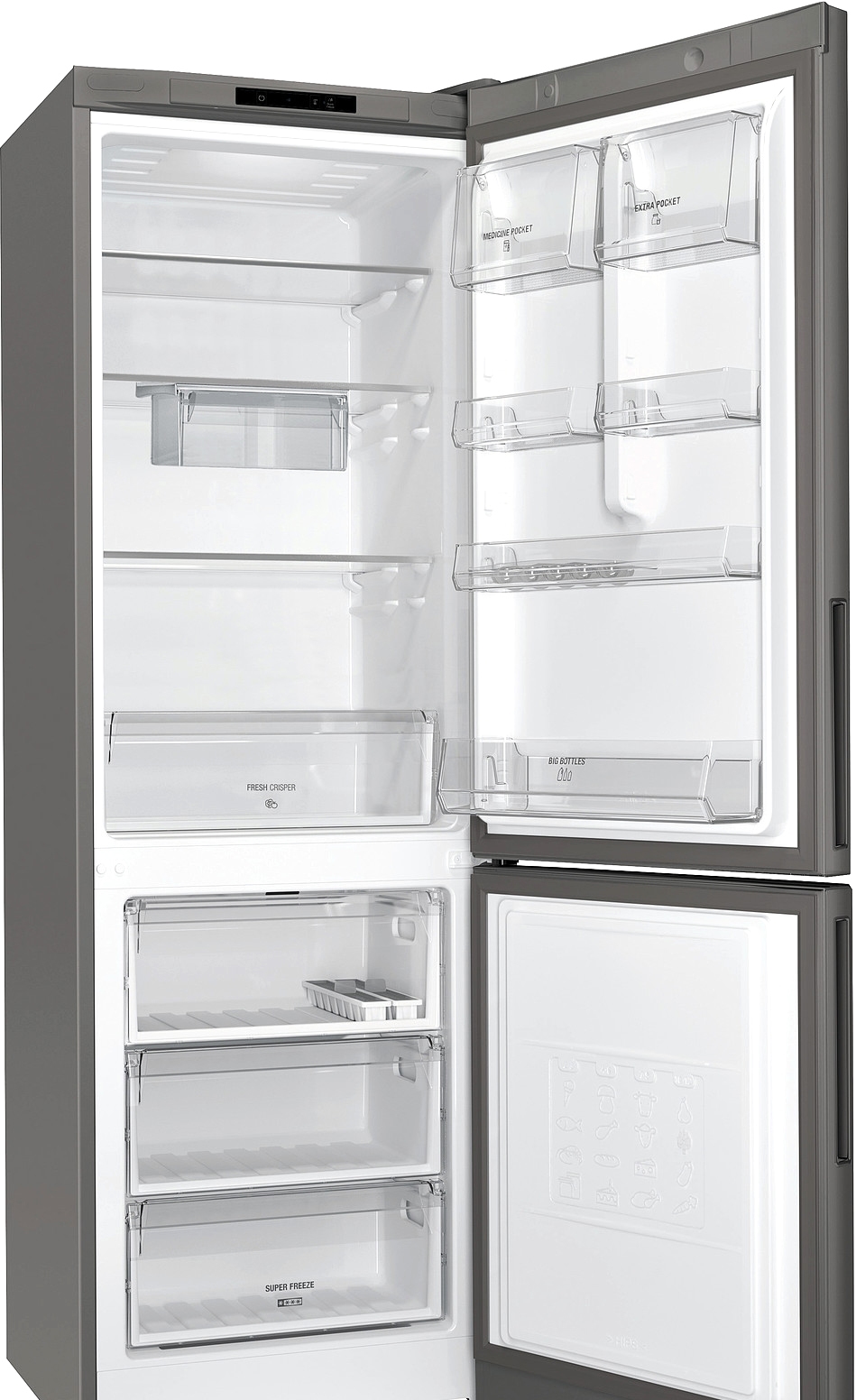 отдельностоящий, без No Frost, электронное управление, класс A+, полезный объём: 324 л (205 + 119 л), зона свежести, перенавешиваемые двери, полка для вина, лоток для яиц, 59.5x62.9x186.8 см, темная сталь