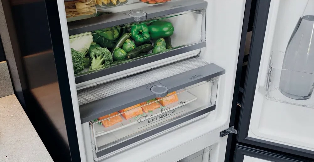 полный No Frost, электронное управление, класс A+, полезный объём: 310 л (227 + 83 л), инверторный компрессор, зона свежести, 60x69x196 см, темная сталь