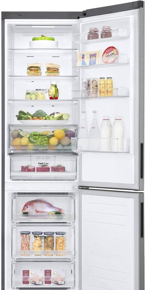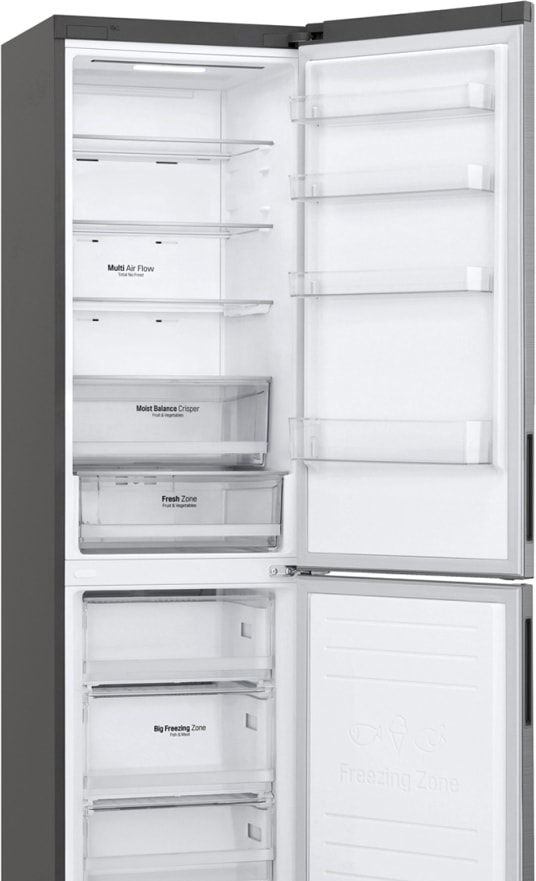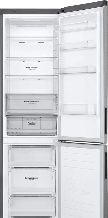 полный No Frost, электронное управление, класс A++, полезный объём: 384 л (277 + 107 л), инверторный компрессор, 59.5x68.2x203 см, серебристый