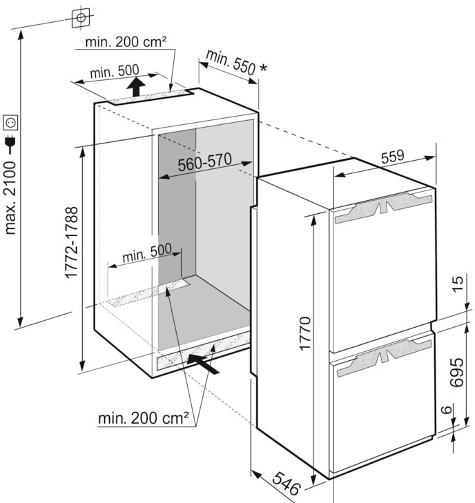 No Frost (морозильная камера), электронное управление, класс A+, полезный объём: 249 л (190 + 59 л), 55.9x54.6x177 см, белый