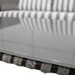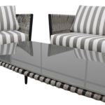 диван + 2 кресла + столик, стол: 1200×600×420 мм, основание - алюминий, столешница - стекло; сиденье: 760×760 мм, материал: ткань