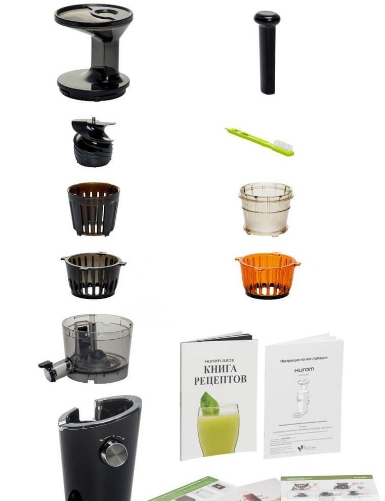 | Комплектация: | - сетка для сока без мякоти; - сетка для сока с мякотью; - насадка для приготовления сорбета; - щётка для чистки; - книга рецептов. |
