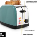 850 Вт, количество тостов: 2, корпус: пластик/металл, 7 степеней обжаривания, цвет бирюзовый